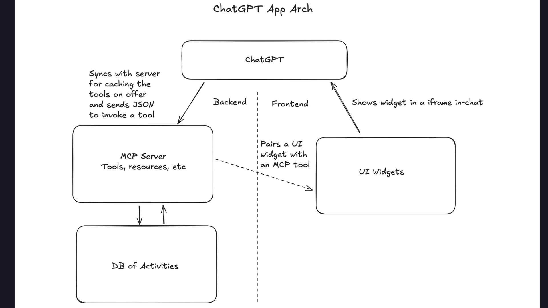 The diagram above shows how the components fit together in a ChatGPT app. The UI widgets are hosted on a frontend server and then the "backend" is hosted separately on an MCP server. Some MCP tools on the server have references to the UI widgets on the frontend and know how to inject the data into those components, in our case a list of recommended activites returned for a user.