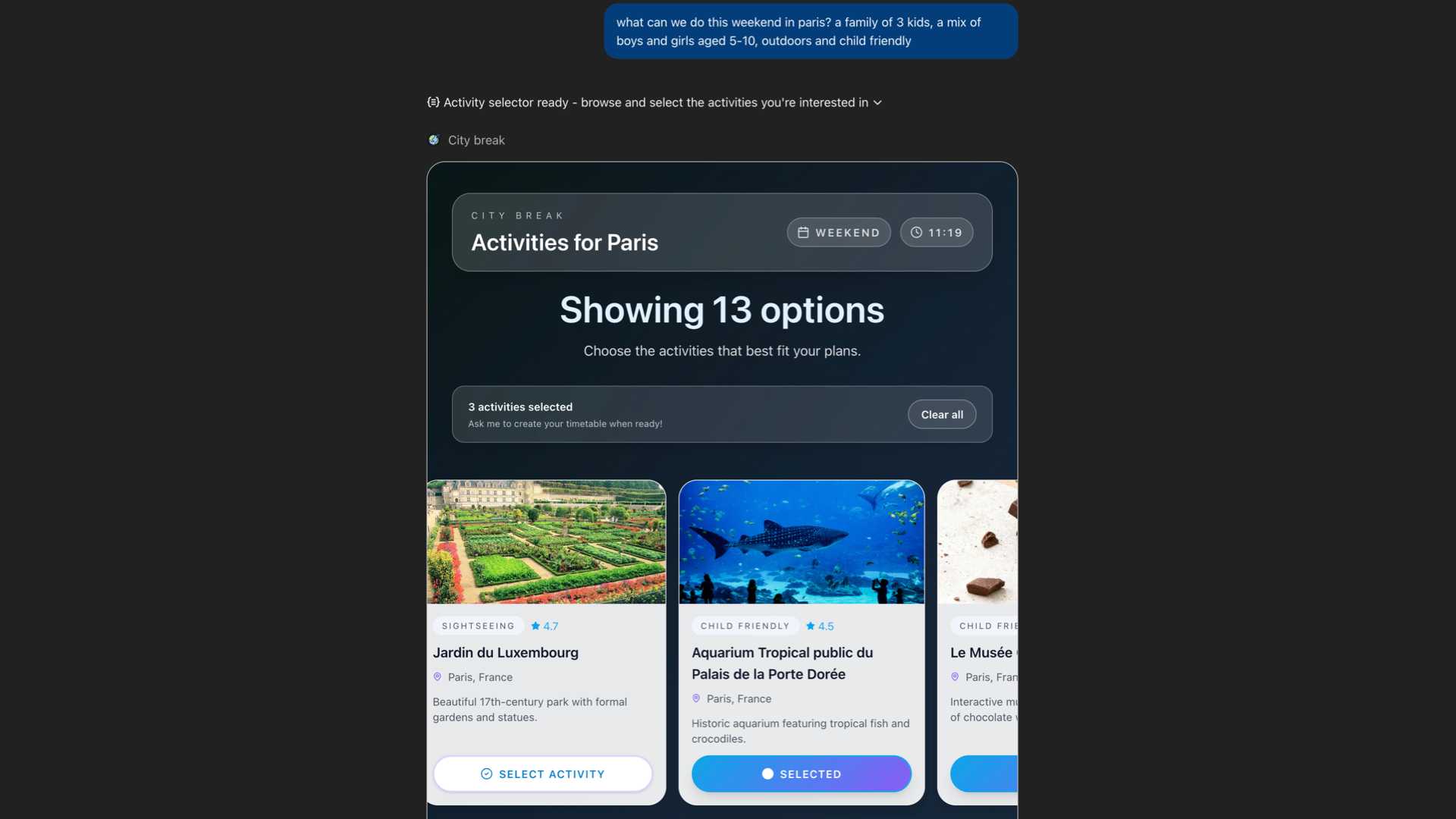 We designed a travel agent–style conversational flow that leads with discovery: questions about interests, group size, pace, and trip constraints. Based on responses, the system generates personalised suggestions presented in an interactive widget, allowing users to pick and refine activities. When a user is ready, the model synthesises those selections into a time-aware itinerary widget with clear timing and next steps, including a call to action.